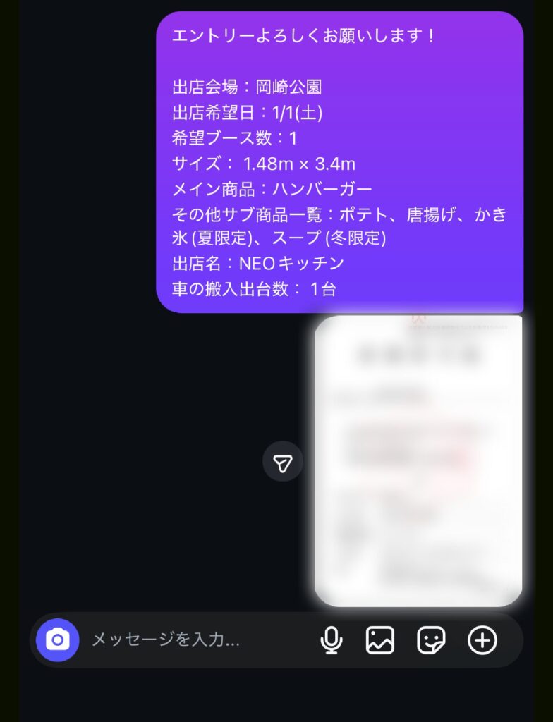 (※飲食関連など必要な方のみ、許可証を写した写真をお送り下さい)